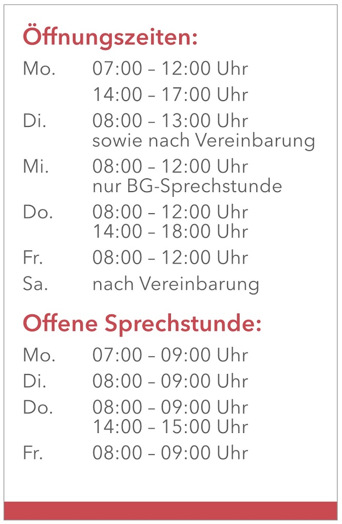 Die Vorstellung von Arbeitsunfällen ist im Rahmen der Praxis-Öffnungszeiten jederzeit und ohne vorherige Terminvergabe möglich.